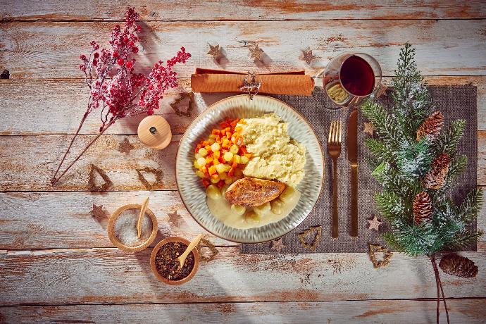 Mals en verfijnd. Geserveerd met een feestelijke druivensaus, geglaceerde groentjes en romige puree.